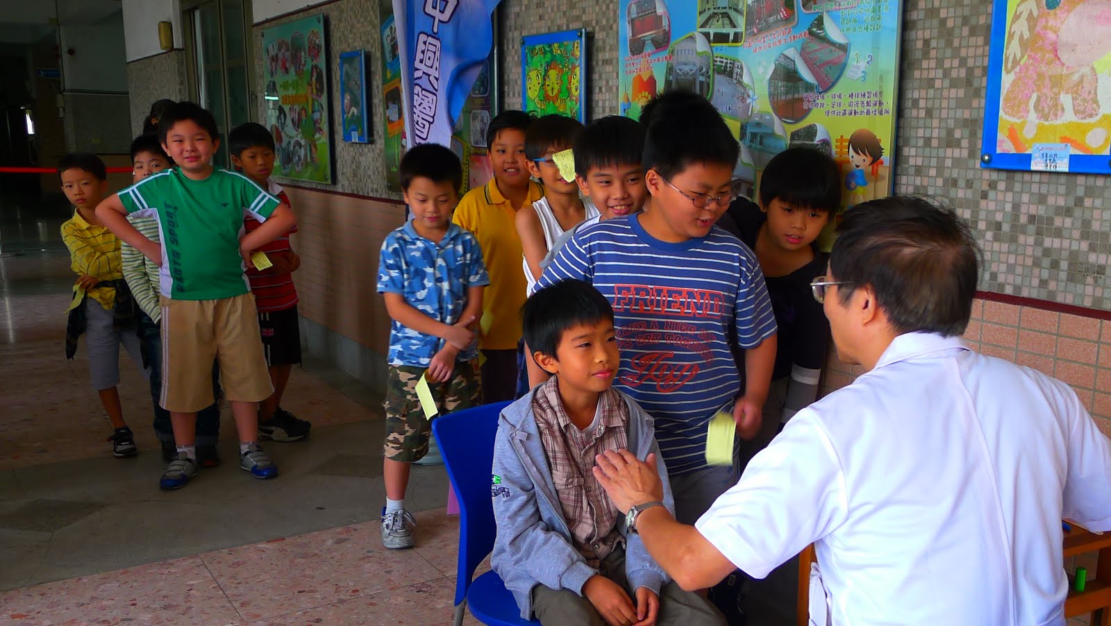 今天上午我們等到注射流感疫苗的通知後,趕緊排好隊伍朝藝文走廊出發。 也許是因為之前的經驗,大家都知道打完針要觀察半個小時,而這半個小時將有烏龍派出所的陪伴,所以孩子們沒有面對針頭的緊張和害怕,只有興奮和期待。