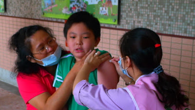 注射完觀察半個小時就可以回教室繼續上課,大家都記得要多喝水,有些小朋友出現手臂紅腫的現象,記得先冰敷到紅腫消退再改熱敷。